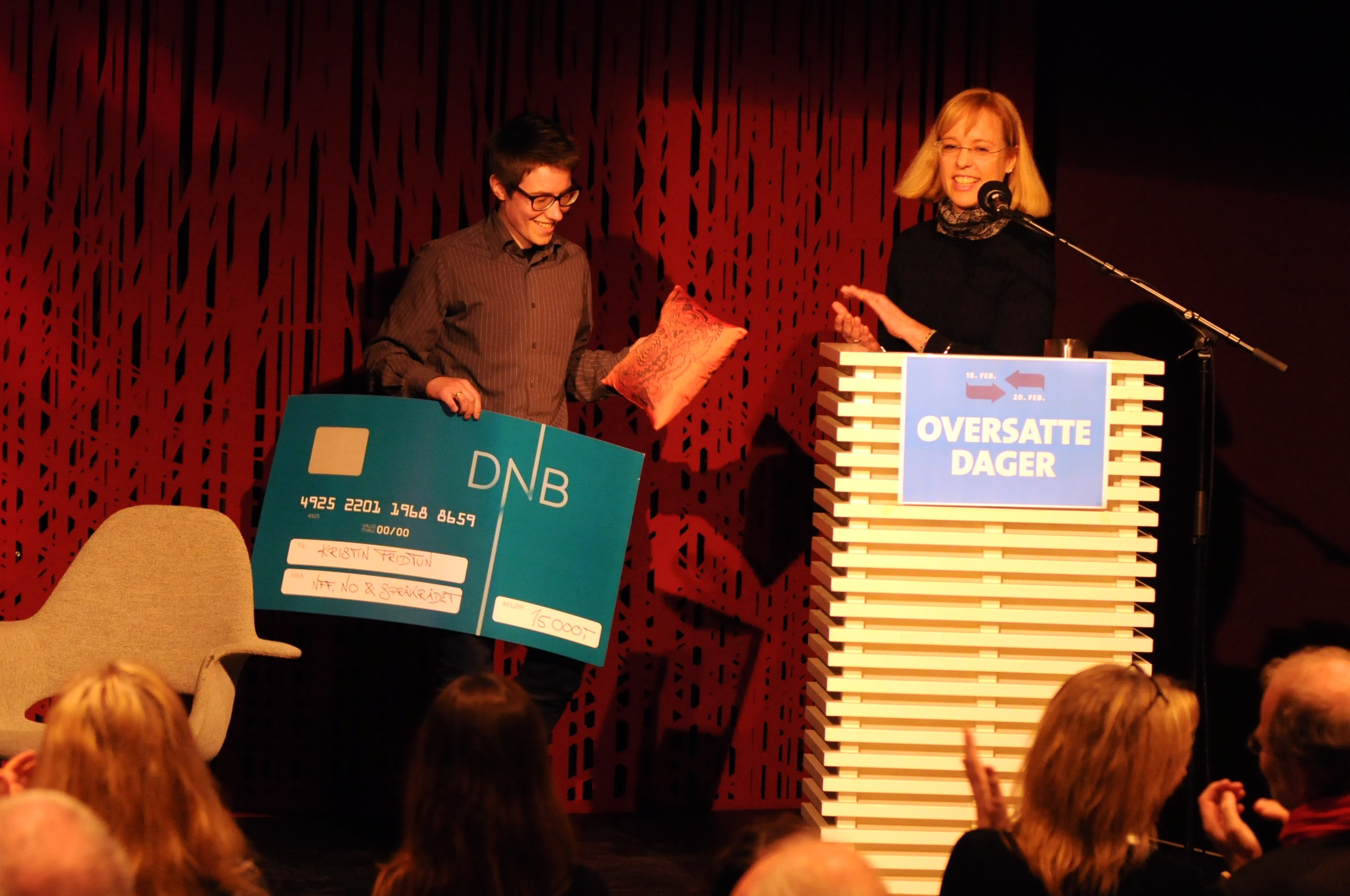 Nedanfor er eit bilete frå utdelinga, med generalsekretær i NFF Tore Slaatta til venstre og direktør i Bokhandlerforeningen Trine Stensen til høgre. Under der att eit bilete frå samtalen min med Espen Søbye på sakprosafestivalen laurdag. Takk til alle som kom og høyrde på oss.